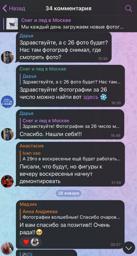 Вот так благодаря новому взгляду на привычные способы продвижения и максимальной вовлечённости рекламная кампания смогла раскачать фестиваль — за месяц событие посетили больше 110 тыс. человек, а в Telegram-канал приходили сообщения с просьбой продлить «Снег и лёд в Москве».