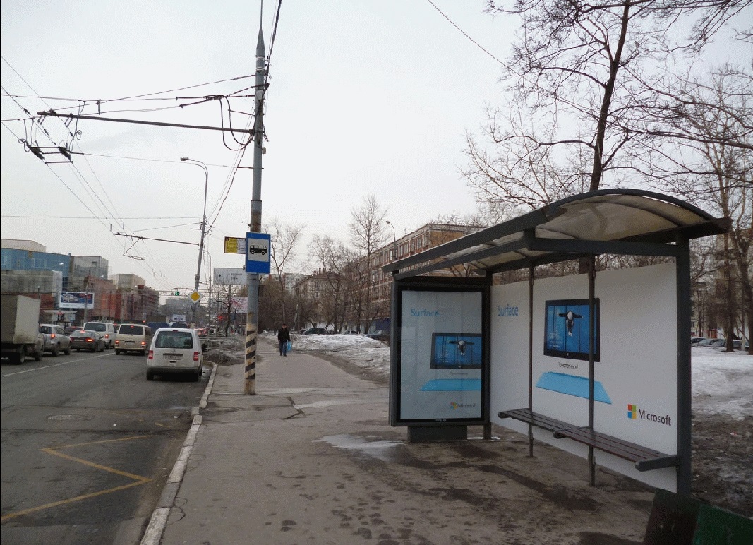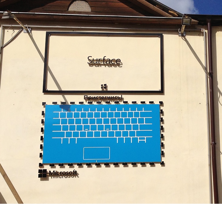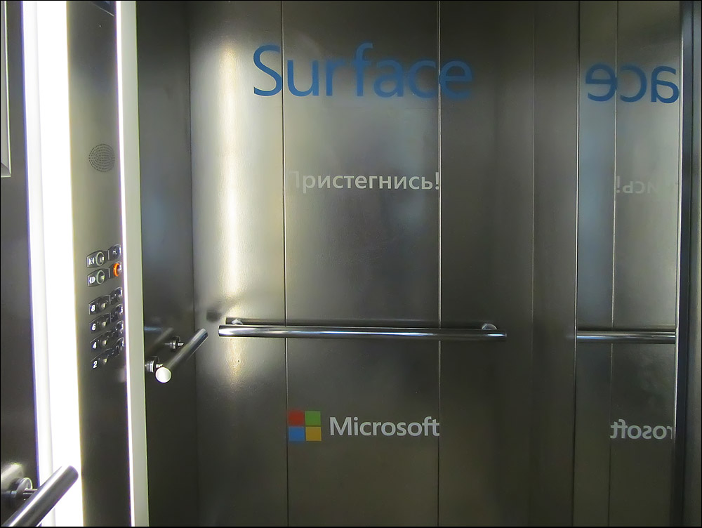 В Москве появились брендированные автобусные остановки с информацией о новом планшете Surface RT, а в торговых центрах города нестандартному брендированию подверглись эскалаторы, лифты, лестницы и входы.