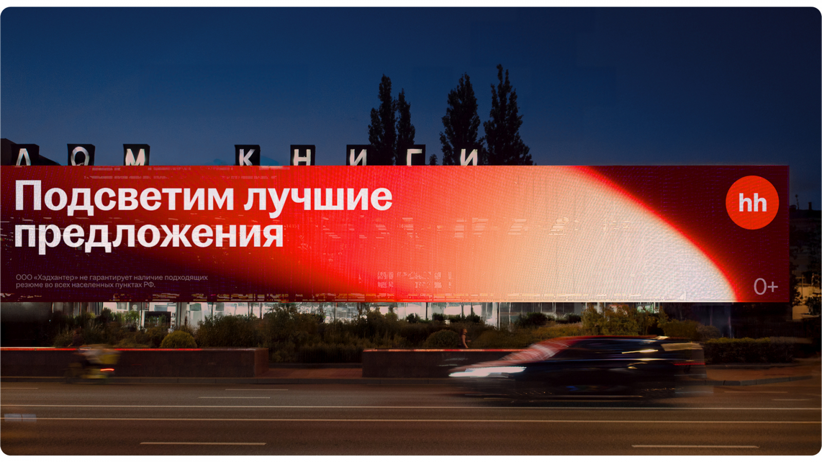 Концепция нового визуального стиля hh.ru — результат совместной работы. Базовая идея «освещать путь» была предложена инхаус-командой hh.ru и получила развитие в визуальной системе, которую разработали ONY. Главным выразительным элементом стал свет. Он задает структуру айдентики: выделяет главное, расставляет акценты, помогает ориентироваться. Сцены строятся по принципу: фон, объект, источник света. Прием применяется в разных форматах: интерфейсы, наружная реклама, фото, иллюстрации.