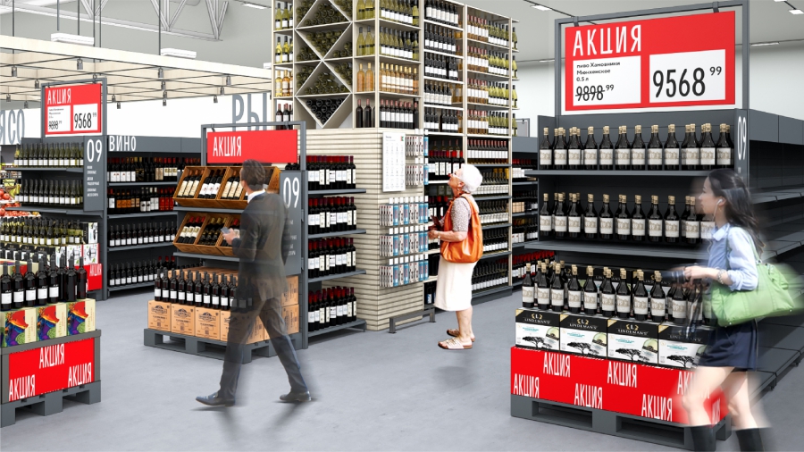 Для удобства ориентирования были созданы навигационные маяки в товарных категориях, причем задействовали не только традиционную горизонтальную навигацию, но и верхний уровень обзора, в том числе потолок.