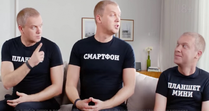 В рекламном ролике кампании Сергей Светлаков предстает в роли сразу трех мобильных устройств, которые требуют интернета и соперничают за внимание хозяина. Но благодаря «Интернету на всё» гаджетам наконец-то удается помириться, ведь теперь у них есть общий пакет интернета на всех.