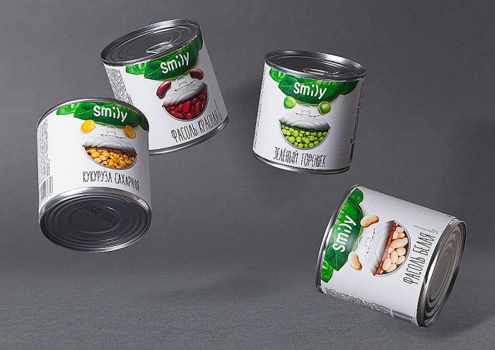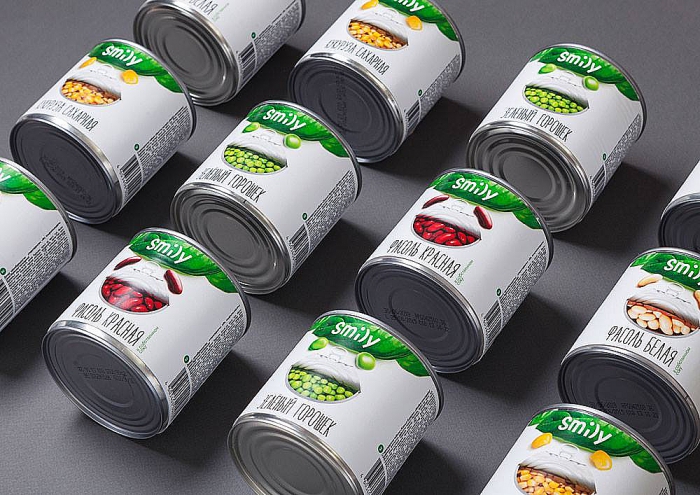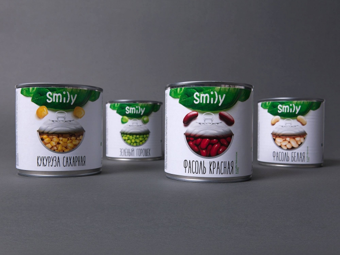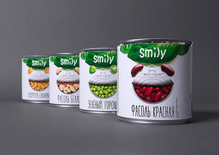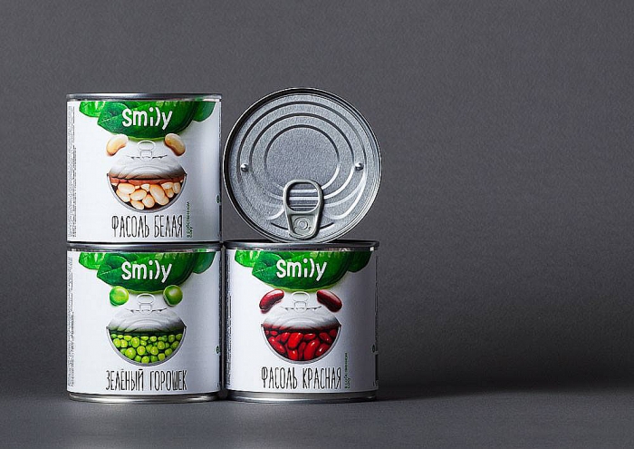 ГК «Эрконпродукт» выпускает новую линейку овощных консервов Smily. Дизайном продукта занялось брендинговое агентство «Гордость». Компания хотела обратиться к следующей целевой аудитории – неконсервативные потребители около 35 лет, доверяющие иностранным маркам. Перед творческой командой стояла задача создать максимально позитивный образ продукта. Было решено сделать акцент на прямом общении с потребителем – наполовину открытая жестяная крышка образует улыбку, ключ напоминает нос, а зерна из банки — глаза. Элементы дизайна представлены на нейтральном белом фоне.