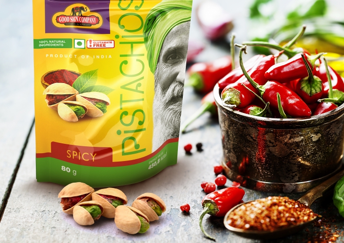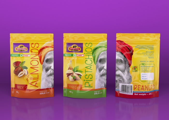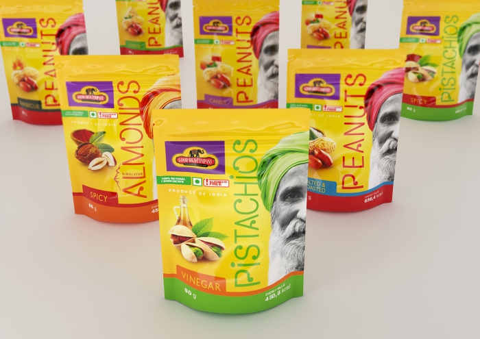 Для нового дизайна упаковки орехов индийская компания Good Sign Company пригласила российское агентство Clёver Branding. Упаковка должна вызывать у аудитории ассоциации с индийской культурой и колоритом. Ключевой образ бренда – старик-индус. Разные категории продукта кодируются ярками цветами его чалмы.