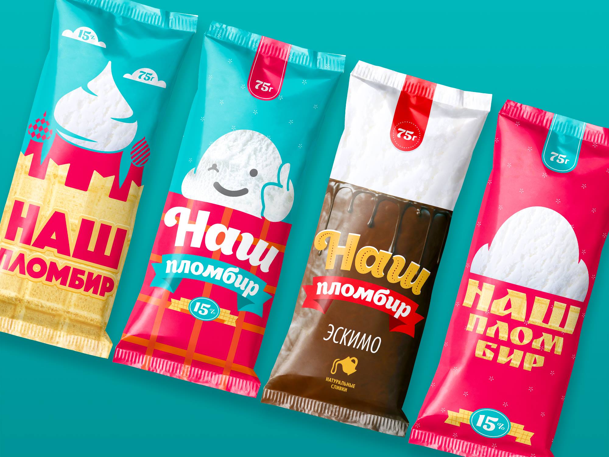 Агентство Style-You представило свой вариант советской стилистики в дизайне упаковки мороженого. Дизайнеры оставили простые образы, но решили акцент на текстуре продукта и ярких красках.