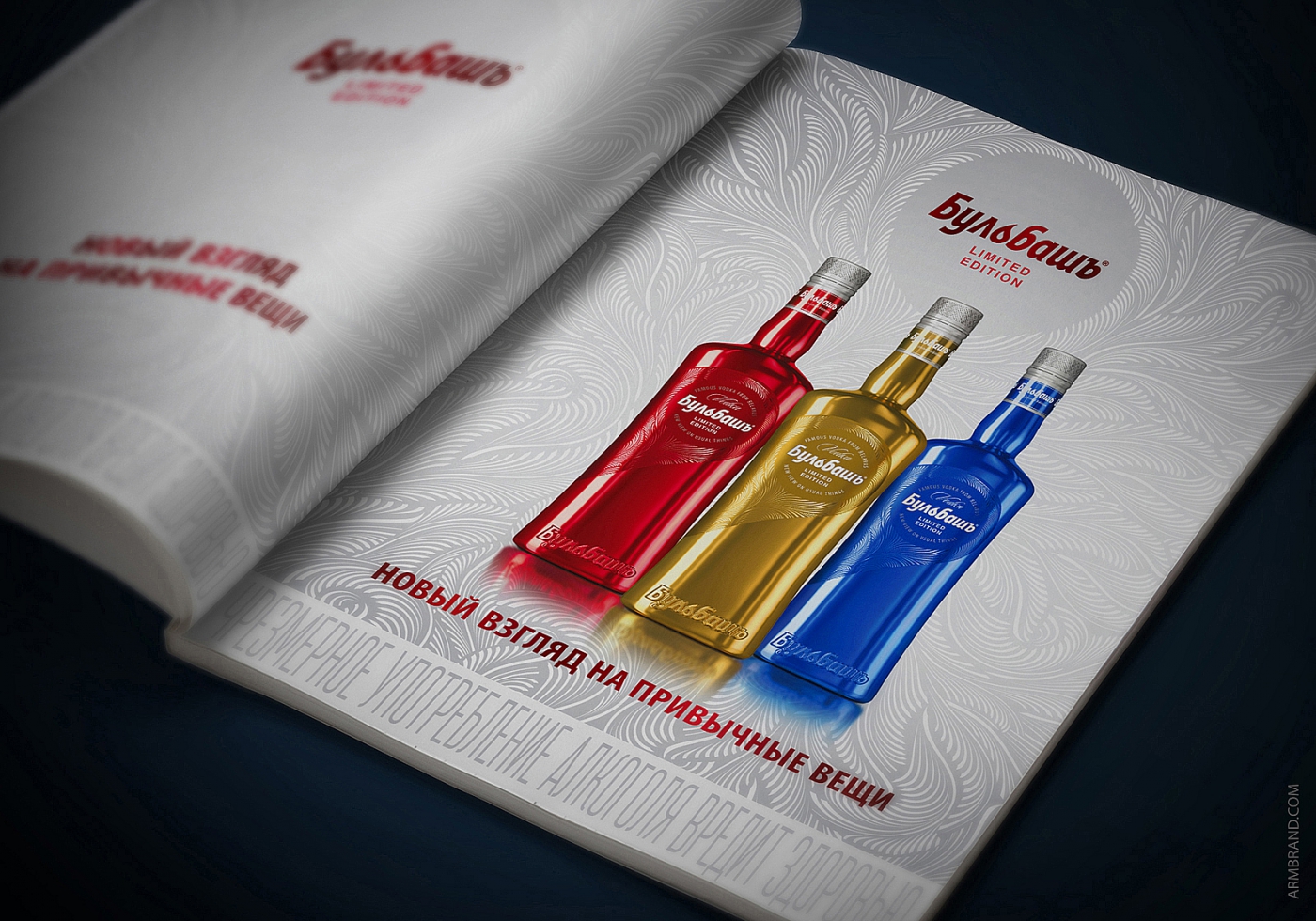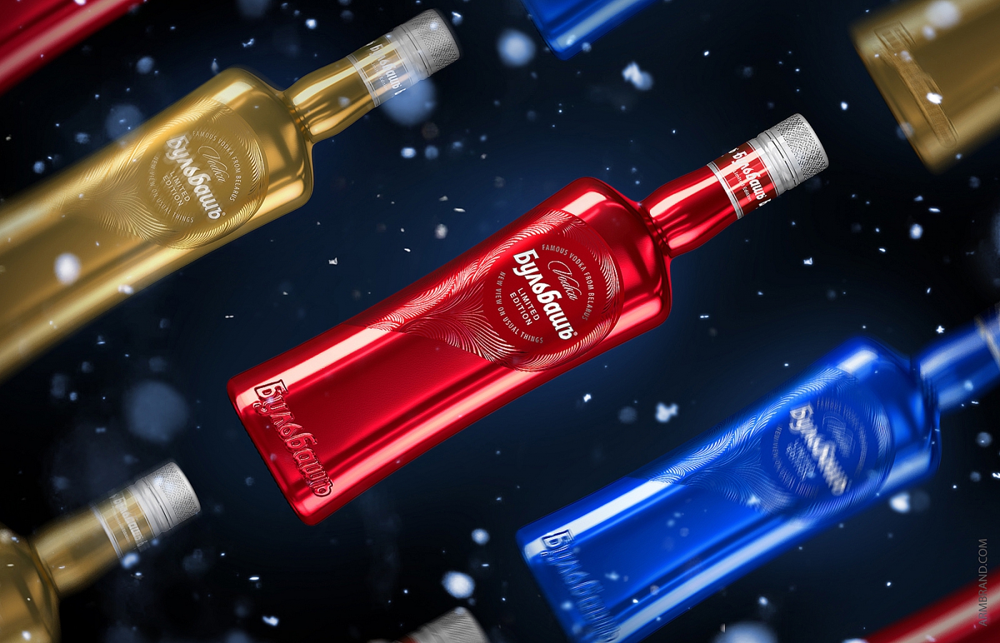Агентство ARMBRAND разработало праздничную серию бутылок для алкогольной компании «Бульбашъ». Дизайнеры хотели добиться сходства бутылок с елочными игрушками. Для этого команда агентства раскрасила стекло в яркие цвета.