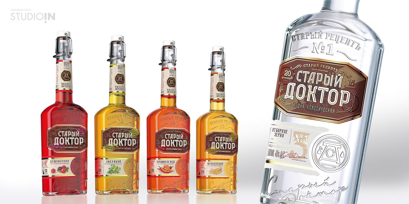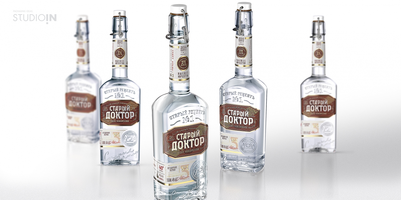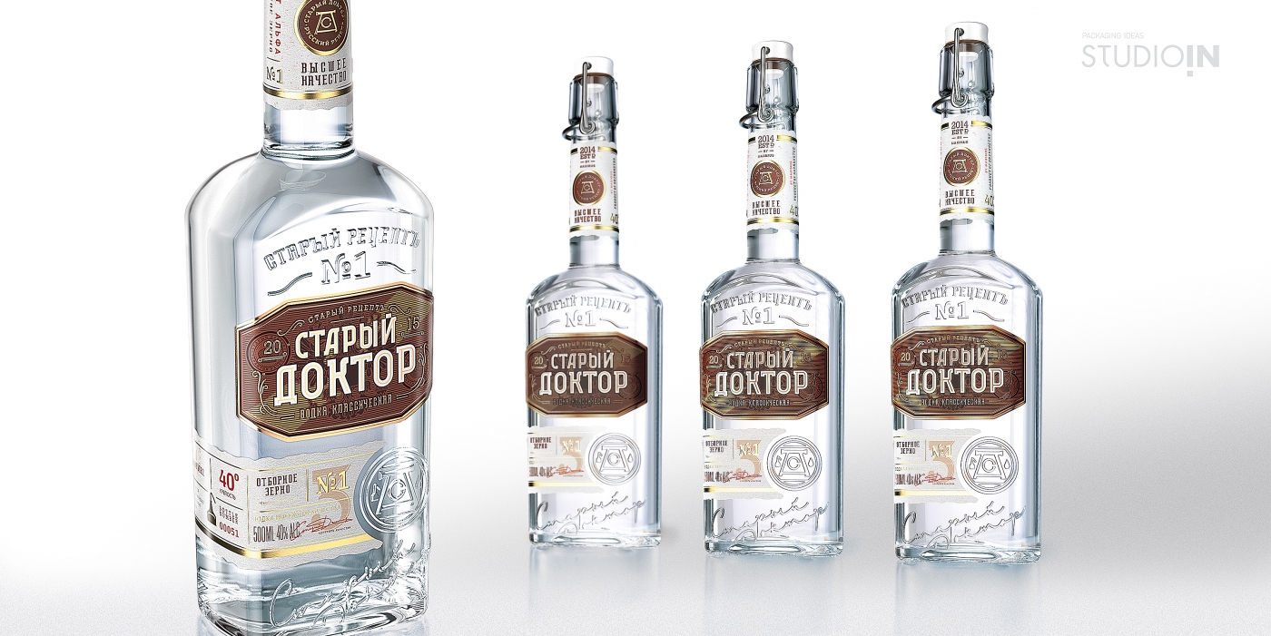 Еще один водочный бренд — «Старый доктор», упаковку для которого разработало агентство STUDIOIN. Творческая команда взяла за основу стиль дореволюционных медицинских сосудов, задействовав винтаж аптекарских символов, рельефные надписи на стекле.