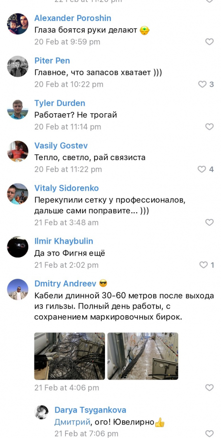 - Профессиональный юмор. Развлекательный контент уместен в любой нише. Мы стараемся не только смешить подписчика, но и вовлекать его в сообщество. Например, в одном посте мы разместили серию фотографий запутанных кабелей «Страшный сон монтажника».