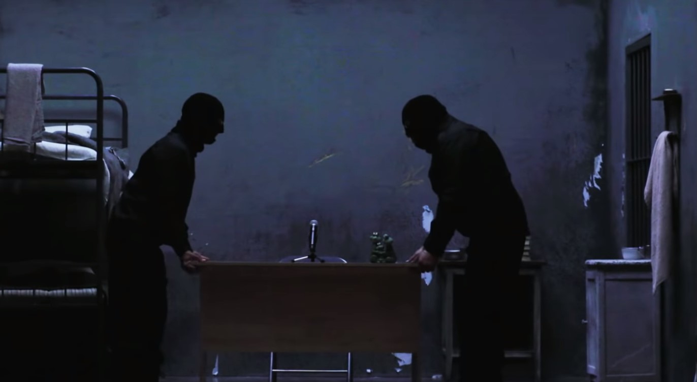 Сцена оформлена как обычная комната в жилой квартире. Но после каждого прочтения в нее заходят люди в костюмах представителей правоохранительных органов и уносят что-то из обстановки. В конечном итоге локация начинает напоминать обшарпанную тюремную камеру.