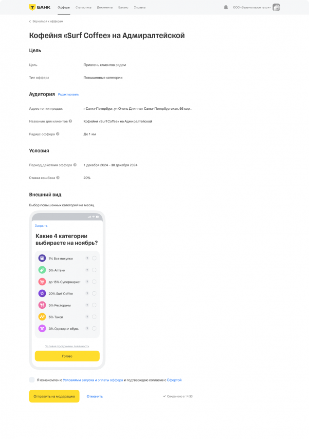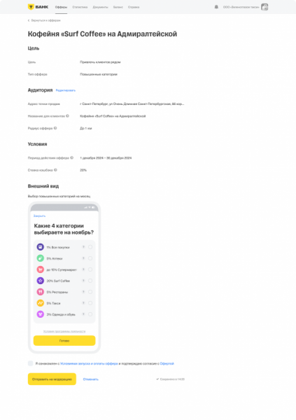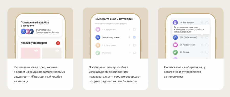 Отмечается, что владельцы офлайн-бизнеса и торговых точек по всей России могут сами размещать предложения в разделе приложения «Повышенный кешбэк на месяц». По собственным данным компании, этот раздел ежедневно просматривают свыше 14 млн клиентов «Т-Банка». Алгоритмы приложения анализируют покупательскую активность в определенном районе и предлагают пользователям выбрать кешбэк за покупки в конкретных магазинах.