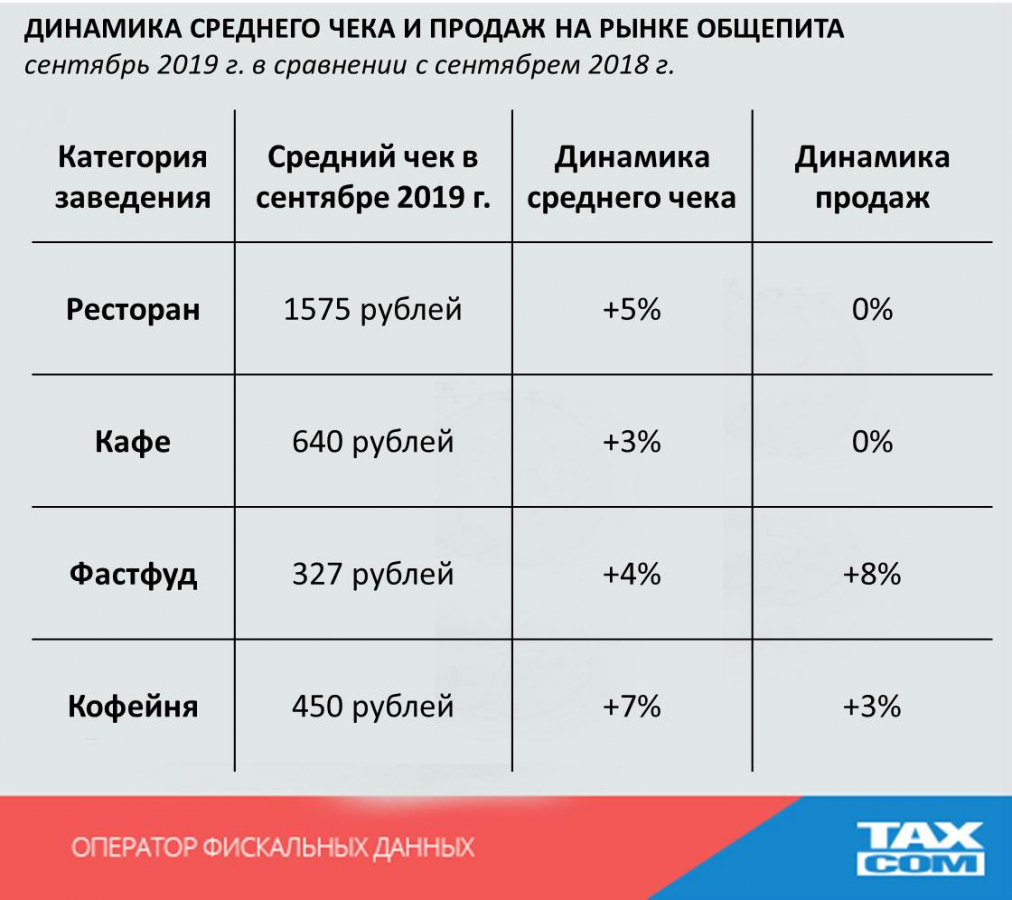 Как отмечают аналитики, объем продаж в сфере общественного питания увеличился на 1,5%, теперь средний чек составляет 1125 рублей. Самые дорогие чеки наблюдаются в ресторанах — в среднем, посетитель такого заведения отдает 1575 рублей.