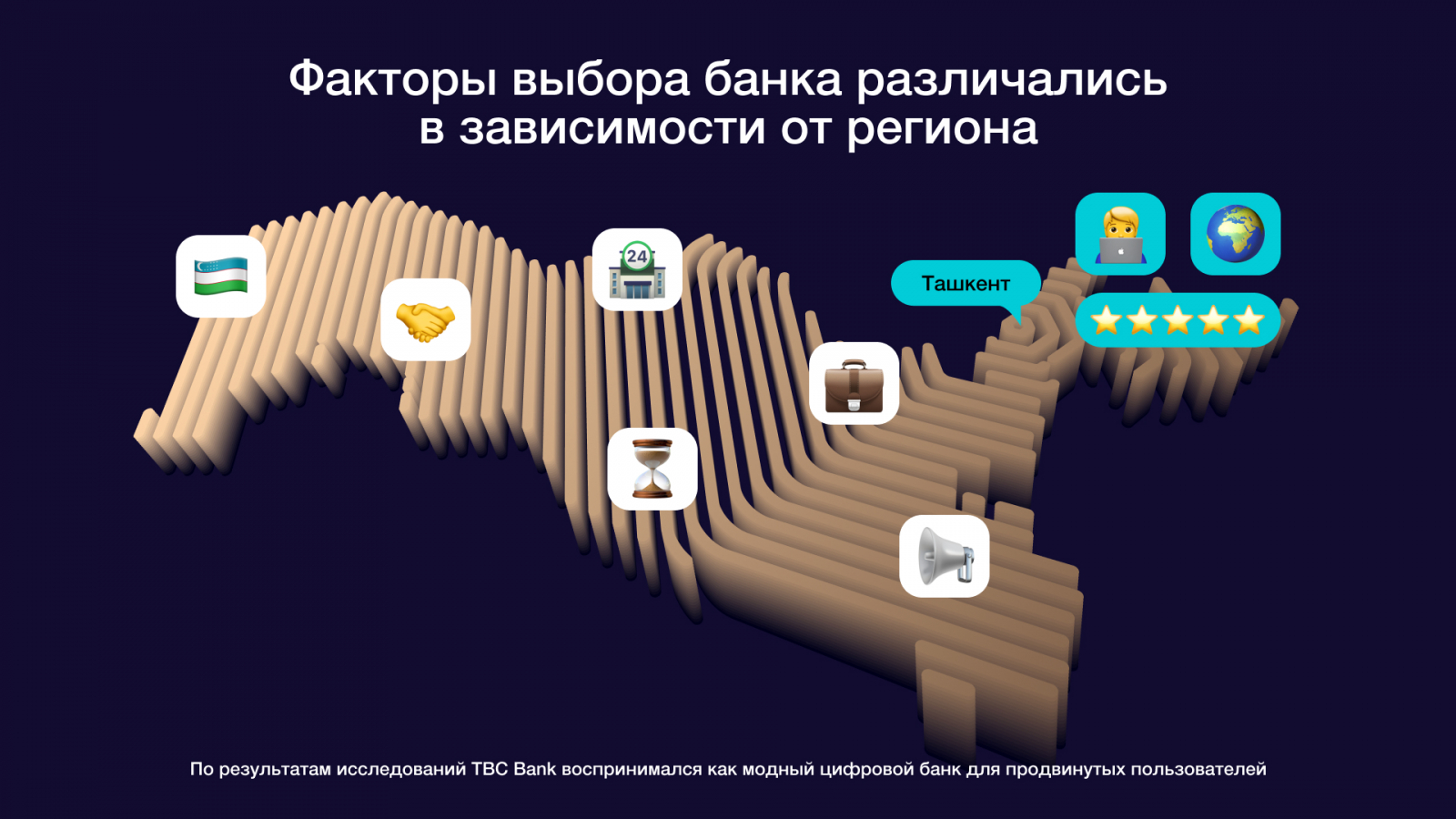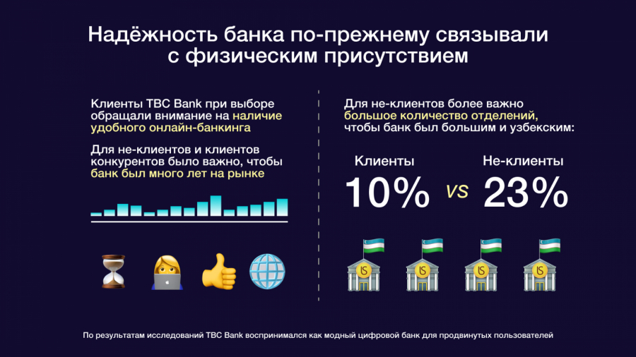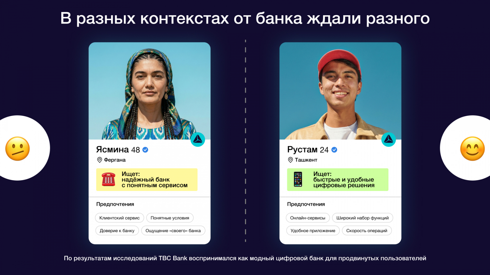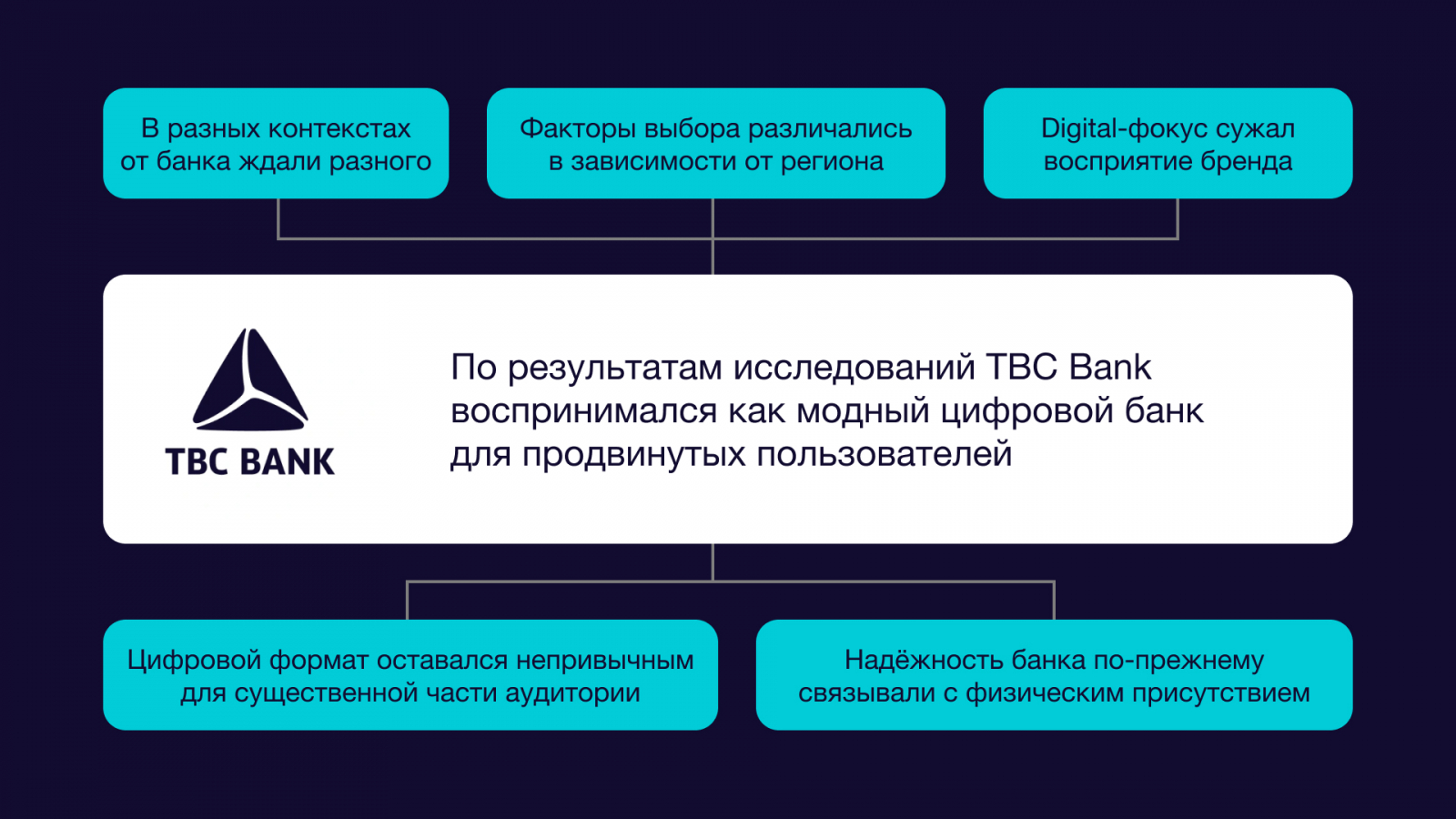 Исследования показали несколько важных барьеров. Во-первых, в регионах банк знали слабее и понимали хуже, чем в столице. Во-вторых, его не всегда ассоциировали с серьезными банковскими продуктами — кредитами, вкладами, картами и полноценным повседневным банкингом. В-третьих, бренд часто считывался как слишком технологичный, сложный и недоступный простым людям. Дополнительным барьером было и то, что часть аудитории воспринимала TBC как иностранный банк, который не до конца понимает местных.