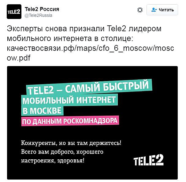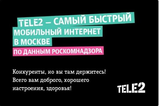 Мобильный оператор Tele2 внимательно следит за политической повесткой. Компания использовала в своей рекламе крымскую фразу премьера Дмитрия Медведева, который посоветовал пенсионерам держаться. Сначала шутка появилась в соцсетях. Tele2 заявил, что у него самый быстрый мобильный интернет в Москве, сославшись на отчет Роскомнадзора. «Конкуренты, но вы держитесь там! Всего вам доброго, хорошего настроения, здоровья!» — иронизировал оператор.