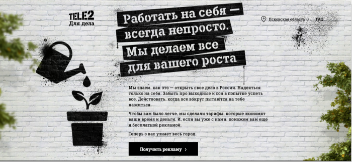 Благодаря digital-проекту любой владелец малого и среднего бизнеса может бесплатно разместить свою рекламу на экране в своем городе или получить таргетированное баннерное размещение в поисковиках. По условиям акции, заказчик, заполняющий заявку на сайте акции, должен быть пользователем тарифов для бизнеса Tele2, а рекламируемый им товар или услуга – легальными.