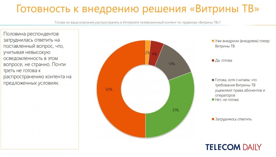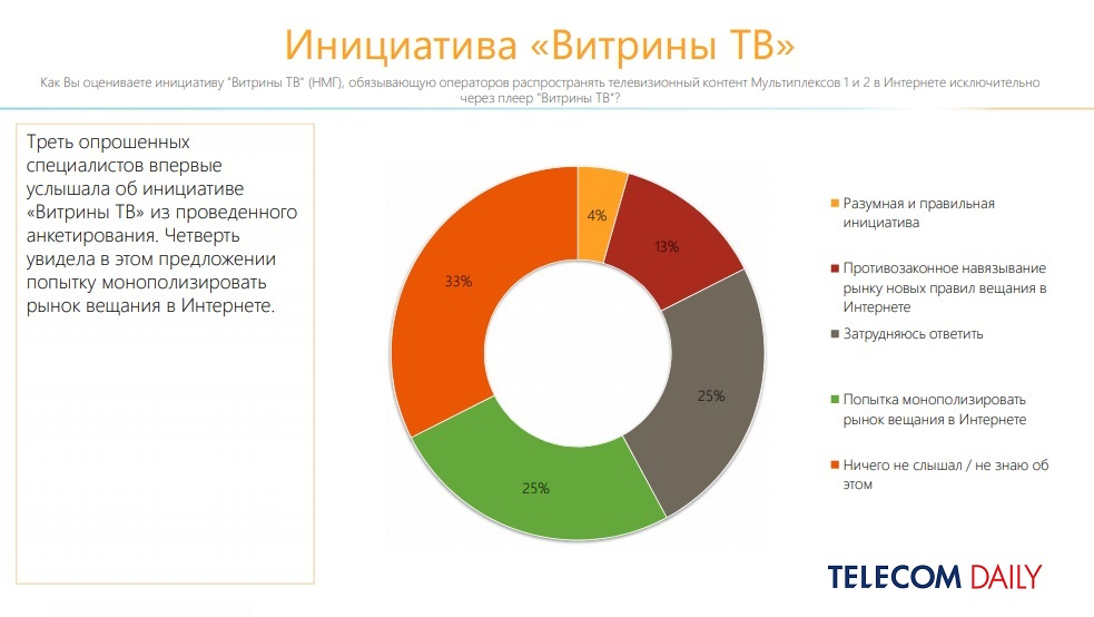 Тем не менее, значительная часть фиксированных операторов, почти 60%, далеки от этого конфликта. Порядка 40% опрошенных инициативу восприняли негативно: многие связали ее с попыткой монополизировать вещание в интернете или с противозаконным навязыванием рынку новых правил вещания в интернете. Только 4% назвали действия учредителей «Витрины ТВ» правильными.