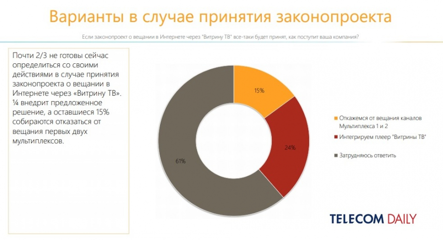Если претензии вещателей, контролирующих «Витрину ТВ», закрепят законодательно (сделают обязательным вещание мультиплексов в интернете через «одно окно»), то более чем 60% опрошенных нужно будет определиться со своей дальнейшей стратегией. А еще 15% обещают совсем отказаться от онлайн-трансляций крупнейших каналов, протестуя против условий работы с этим сервисом.