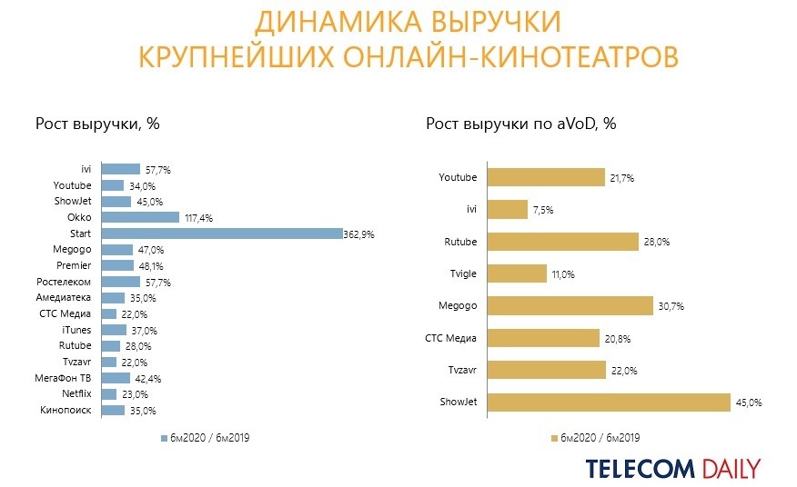 На ivi и Okko приходится 40% рынка в денежном выражении, они продолжают лидировать на рынке. Доля первого не изменилась, а второго — выросла на 5%. Youtube, Netflix, Megogo, «Ростелеком» снизили доли. Самый значительный прирост доходов — у Start (в 3,5 раза) и Okko (в два раза).