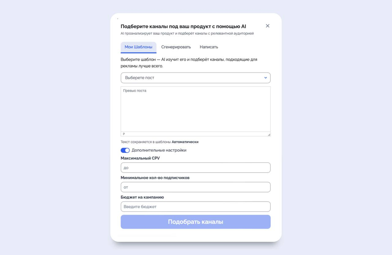 Далее система сопоставляет эти данные с базой из проверенных каналов, в каждом из которых проанализированы в среднем 1 500 постов. При этом подбор каналов основывается не только на тематическом соответствии, но и на данных о более чем 2 млн ранее реализованных через платформу размещений. Нейросеть выделяет те из них, что показали наилучшие результаты, и использует их как ориентир для новых рекомендаций. На выходе — список каналов, отсортированный по степени тематического и стилистического совпадения.