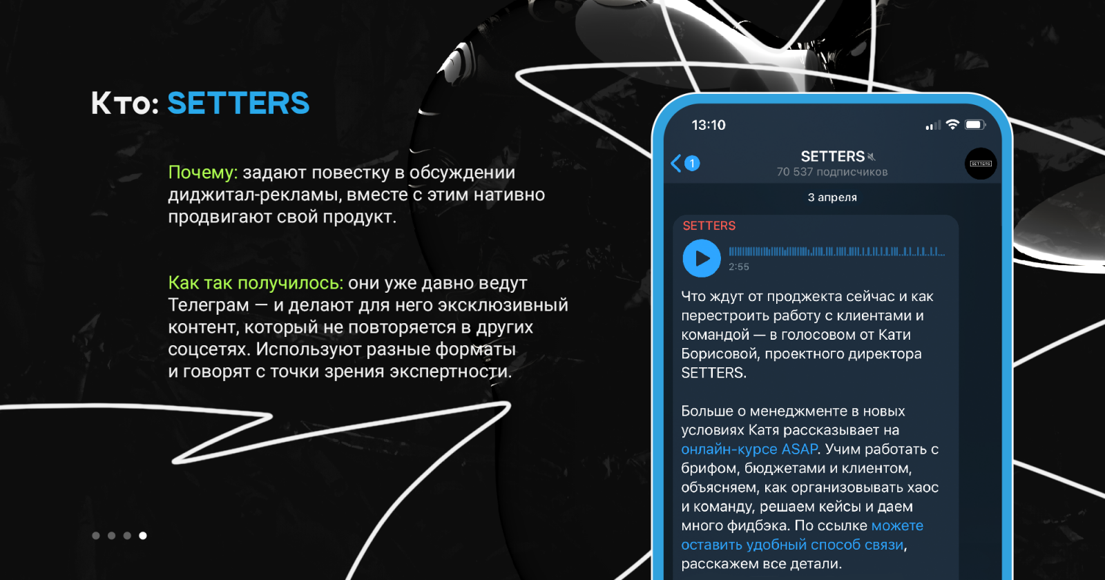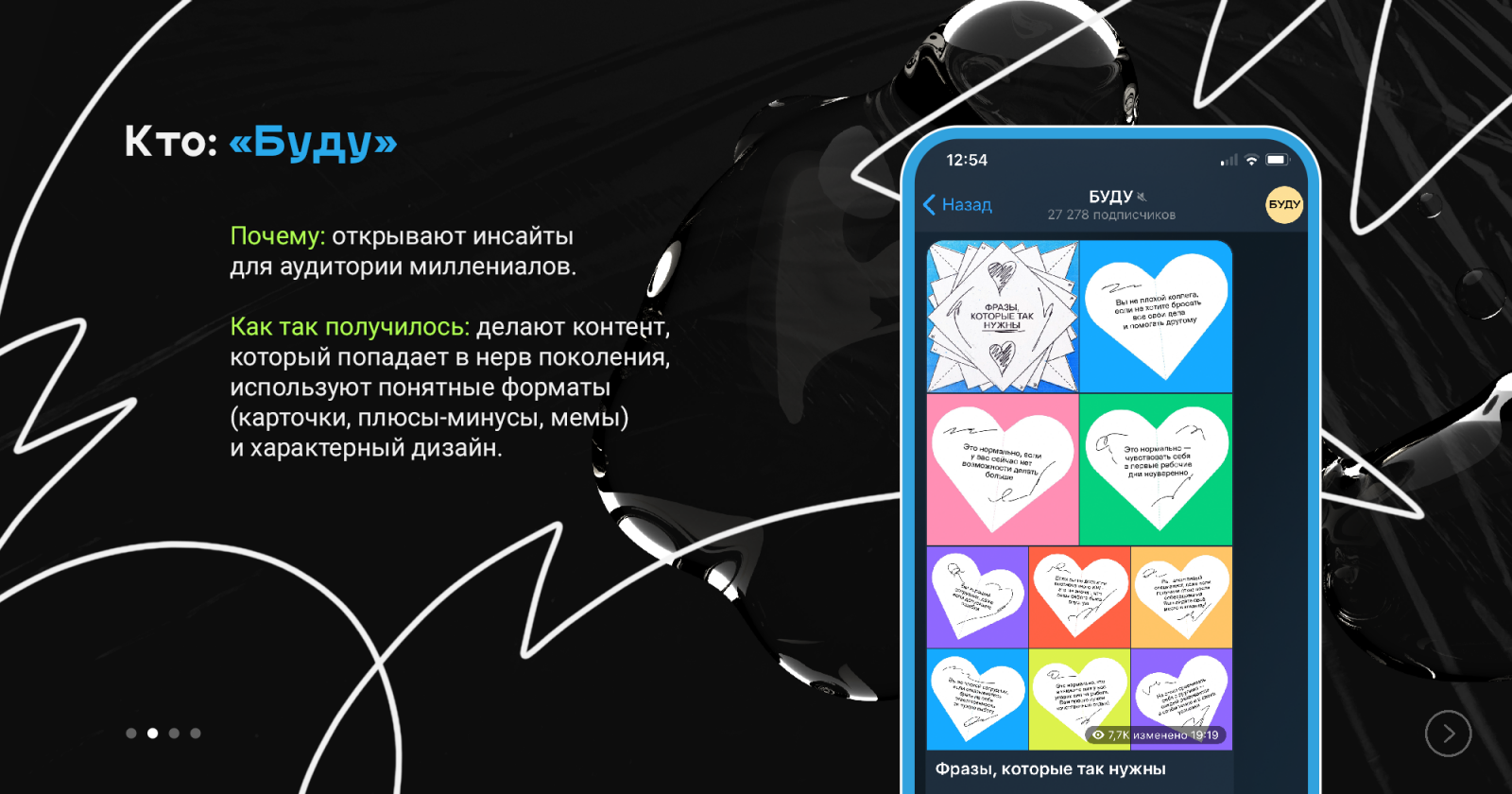 В-третьих, канал вашего бренда соседствует с десятками чатов — конкуренция за внимание большая. Чтобы выиграть, вы должны постить полезный и креативный контент. Будете постить только продуктовый контент — потеряете вовлечённость.