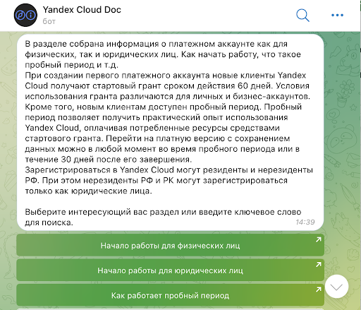 Для облачной платформы «Яндекс» сделали бота, где бизнес и обычные пользователи могут пользоваться инфраструктурой и мощностями «Яндекса» для реализации сложных технических проектов: ML, облаком, серверами и другими фишками гиганта. В сервис за месяц зашло более 700 уникальных пользователей.