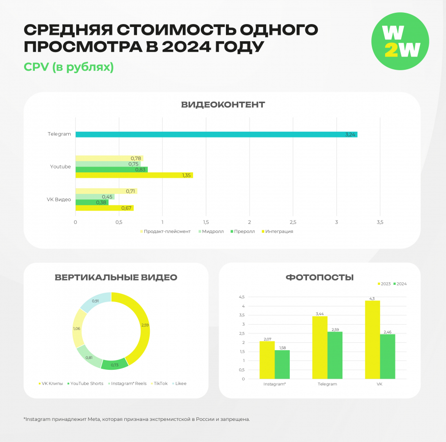 По данным авторов исследования, самый низкий CPV в 2024 году у фотопоста — наиболее популярного формата у инфлюенсеров, который предлагают 86,5% из них (72,5% — в Instagram (запрещённая в России соцсеть; принадлежит Meta, которая признана экстремистской и террористической организацией в РФ), 96,2% — в Telegram, 93,5% - в VK). За год показатель ощутимо снизился на всех ключевых площадках: в Instagram — с 2,07 до 1,58 (снижение на 23,6%), в Telegram — с 3,44 до 2,59 (снижение на 24,7%), в VK — с 4,30 до 2,46 (снижение на 42,8%). «Это говорит о том, что в среднем просмотры на пост растут, но блогеры не торопятся повышать цены», — указывают аналитики.