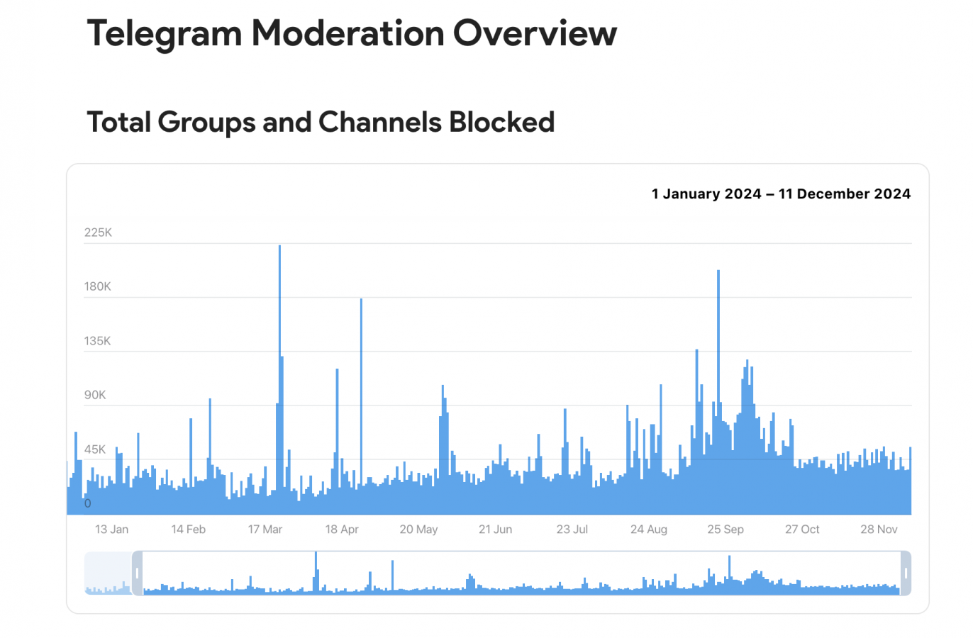 Сейчас на сайте Telegram доступна статистика с 12 декабря 2023-го по 11 декабря 2024-го. Больше всего ресурсов было заблокировано 23 марта — более 224 тыс.