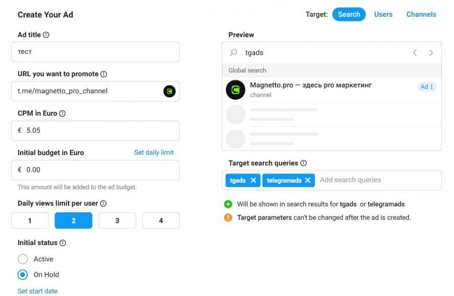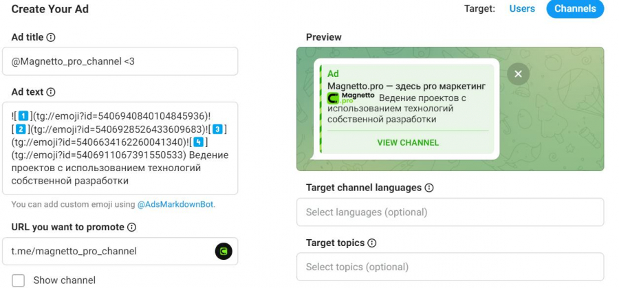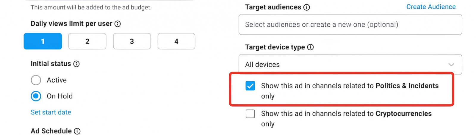 Telegram Ads также добавил новую функцию в раздел Target Users. Теперь можно выбрать опцию «Показывать только в каналах, связанных с тематикой Politics & Incidents». Если активировать эту галочку, объявление будет показываться исключительно в новостных каналах, которые освещают события в этих областях. При этом минимальная ставка CPM составит всего 0,5 евро.
