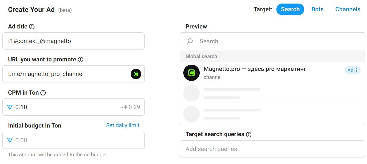 При поиске по ключевым словам пользователи будут видеть не только соответствующие каналы, но и спонсируемые объявления. Это открывает новые возможности для запуска рекламы на конкурентов. В отличие от традиционных поисковых систем, пользователи Telegram чаще ищут конкретные каналы или бренды, что делает объявления, настроенные по ключевым словам конкурентов, весьма эффективными.