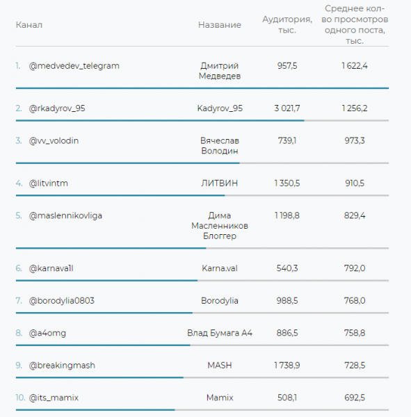 В лидерах, по данным «Медиалогии», оказались также Telegram-каналы главы Чечни Рамзана Кадырова и спикера Госдумы Вячеслава Володина. В топ-10 попали аккаунты блогеров Михаила Литвина, Димы Масленникова и Влада A4. Среди СМИ самый просматриваемый канал у Mash, он на девятом месте.