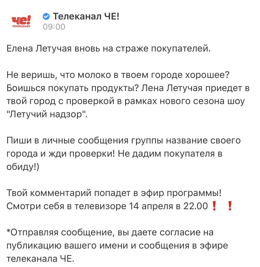 Телеканал «ЧЕ!» многократно проводил в ОК разнообразные спецпроекты с совершенно разными механиками. Спецпроект, приуроченный к выходу нового шоу «Летучий надзор», — особая история. Впервые телеканал решился на вовлечение пользователей, которое напрямую влияет на контент шоу. Пользователи ОК активно вовлекаются в подобные механики, а тема справедливости, которую каждый выпуск восстанавливает Елена Летучая, только подстегивает их интерес.