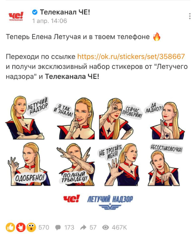 Стикерпак с Еленой Летучей в «Одноклассниках» привлек к участию полмиллиона пользователей. Около тысячи пользователей ОК оставили комментарии с названиями городов, куда должна приехать Елена Летучая, и получили возможность попасть в эфир телеканала «ЧЕ!».