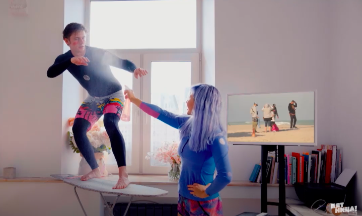 Из подручных средств они воссоздали дома багажную ленту и взлёт самолета, отдых в палатке, коктейли на пляже, сёрфинг и спуск на сноуборде.