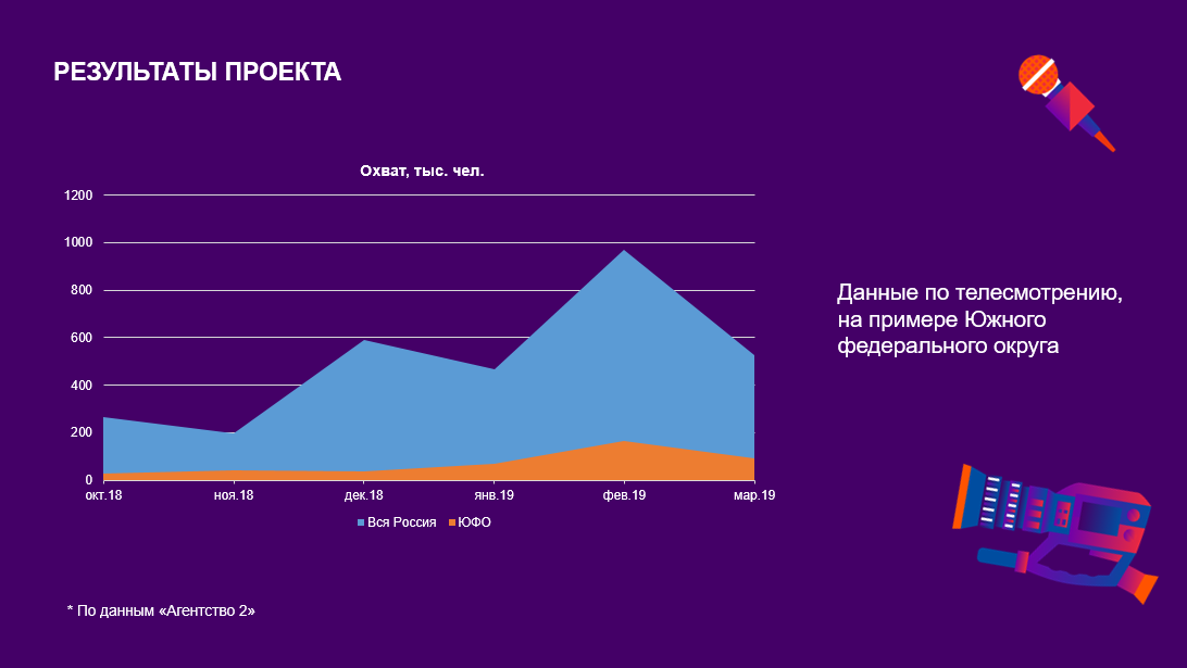В первом квартале 2019 года мероприятия проходили на территории Южного федерального округа. На графике видно, что в этот период наблюдаются повышенные относительно предшествующих трех месяцев показатели охвата и доли телеканала. При этом рост охвата «Рыжего» по всей России происходит одновременно с ростом в ЮФО.