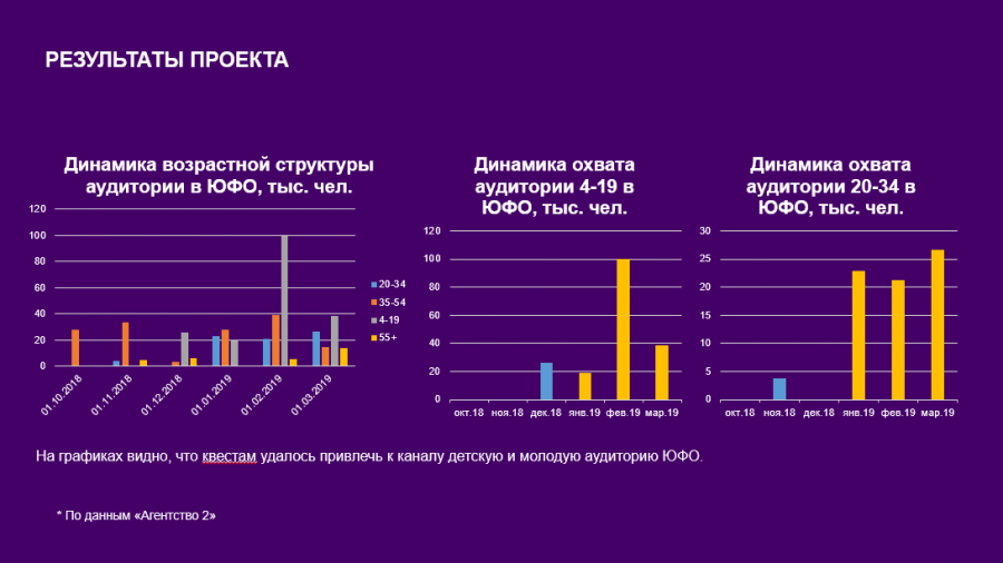 Для телеканала «Рыжий» этот проект в первую очередь — возможность познакомить потенциальных зрителей с телеканалом, заинтересовать и привлечь к телесмотрению. Квесты дали нам возможность лично познакомиться с аудиторией — услышать ее пожелания, узнать, чем интересуются юные зрители и их родители, чтобы в дальнейшем скорректировать эфир. Сейчас, благодаря квестам, мы видим устойчивый интерес к телеканалу «Рыжий»: по сравнению с прошлым годом охват среди целевой аудитории 4−12 лет вырост на 30%, а длительность телесмотрения в этой же возрастной категории увеличилась на 75%.