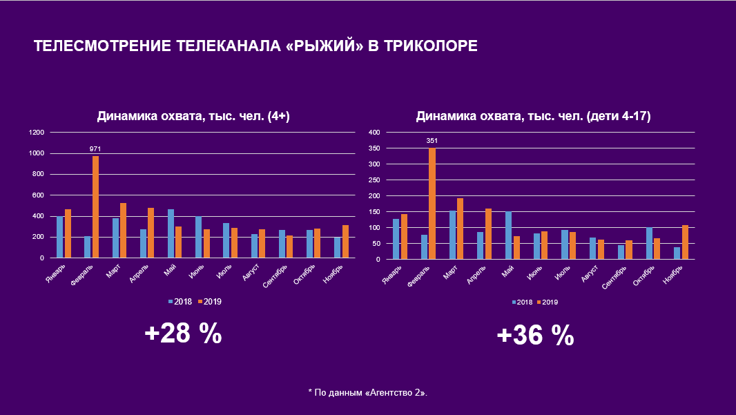 Команда проекта проанализировала изменения рейтингов «Рыжего» в «Триколоре», взяв для сравнения 2018 год. По данным «Агентства 2», прирост аудитории в возрастной категории 4+ составил 28%, а в целевой аудитории 4−17 лет — 36%. При этом, например, в феврале 2019 охват в 4,5 раза выше, чем в тот же месяц в 2018.