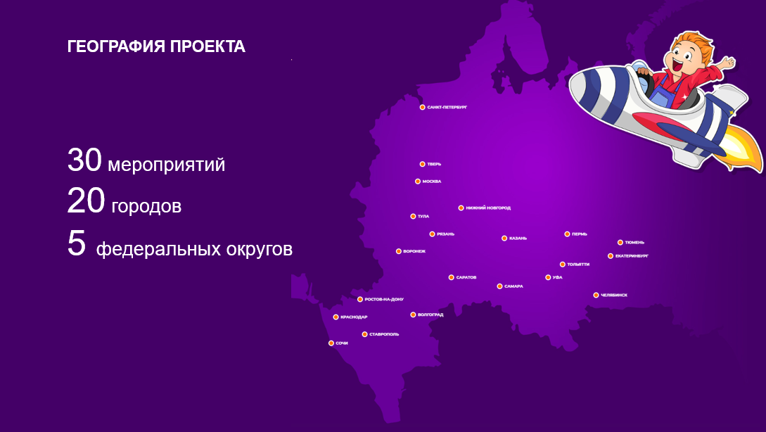 Проект был рассчитан на весь 2019 год — 30 мероприятий в 20 городах пяти федеральных округов: Южного, Центрального, Уральского, Северо-Западного и Приволжского, поэтому для реализации было решено привлечь агентство Win2Win Communications. Они взяли на себя разработку дизайна, онлайн- и офлайн-продвижение, а также застройку и организацию на месте.