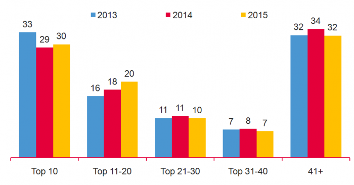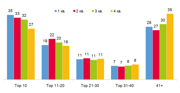 Рассмотрим подробнее поведение крупнейших рекламодателей. В 2015 г. бюджеты десятки самых крупных рекламодателей сократились на 11% по сравнению с предыдущим годом, но ее доля в федеральном размещении выросла на 1 п.п. Суммарные бюджеты относительно мелких и средних рекламодателей (группа «41+») упали на 18%, что соответственно сказалось на их доле (-2 п.п. к 2014 г.). Однако уже второй год подряд доля «41+» все равно оказывается выше доли ТОП-10.