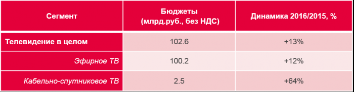 По данным АКАР, за три квартала 2016 года рекламные бюджеты российского телевидения выросли на 13% к аналогичному периоду 2015 года и составили 102.6 млрд. рублей без НДС (включая рекламные бюджеты предвыборной кампании в Госдуму – около 0.6 млрд. руб.).