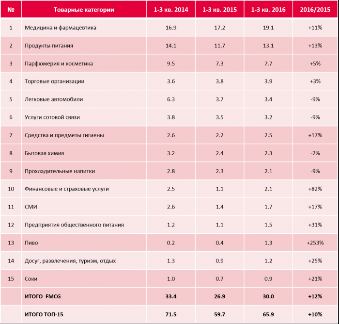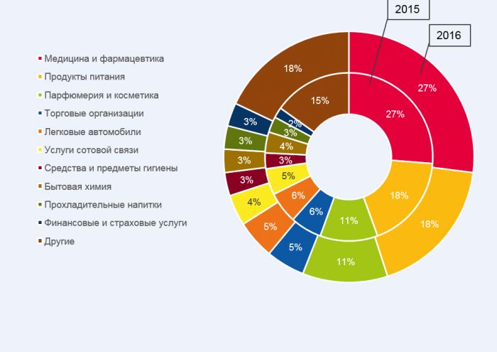 В рейтинге крупнейших категорий товаров и услуг (по размеру суммарного рекламного бюджета) за рассматриваемый период не произошло значительных изменений относительно прошлого года. Практически каждая категория из первой десятки сохранила свой вес на рынке. Лидерство по объему расходов на рекламу по-прежнему сохраняют производители лекарственных препаратов – категория занимает более четверти рынка. Второе и третье место у «Продуктов питания» и «Парфюмерии и косметики». Суммарно на три категории приходится более половины рынка.