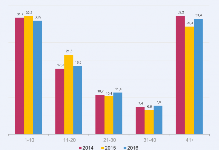 По итогам трех кварталов 2016 года можно констатировать значительное снижение концентрации крупнейших рекламодателей на национальном телевидении (первой 20-ки с наибольшими бюджетами) – на 4.5 п.п. по отношению к аналогичному периоду прошлого года – и увеличение доли средних (вторая и третья 10-ки) и особенно небольших (группа «41+») рекламодателей. Подобное перераспределени