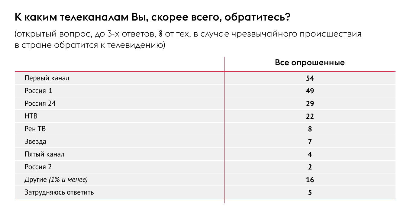 Для тех, кто для получения информации в ЧС выбирает телеканалы, наибольшую популярность имеет «Первый канал» (54%). Также в топ входят «Россия-1» (49%), Россия-24 (29%) и НТВ (22%).