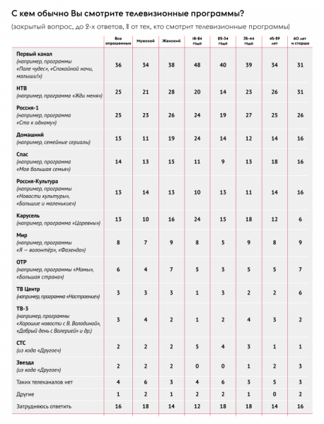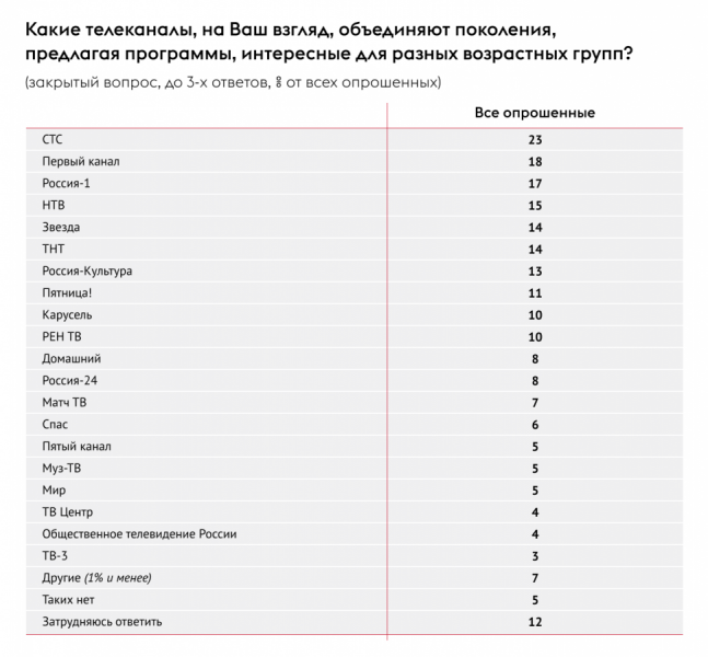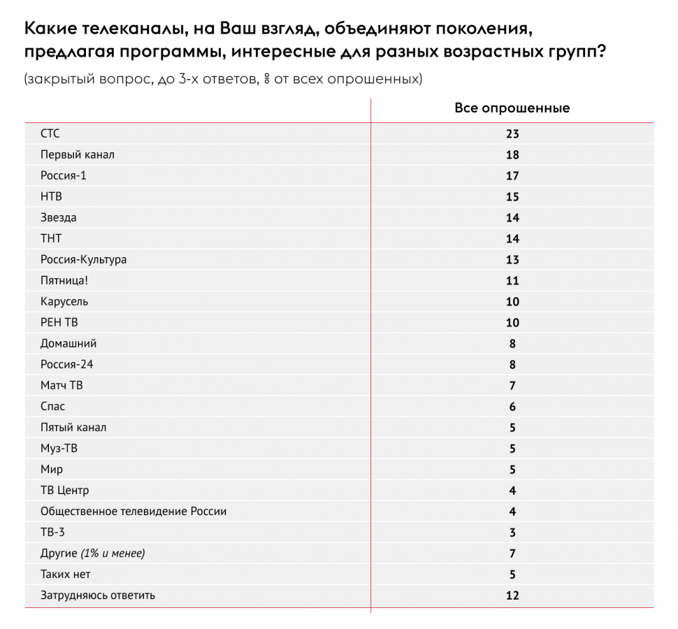 В ответ на вопрос, какие телеканалы объединяют поколения, предлагая интересные для разных возрастных групп программы, 23% респондентов назвали СТС, 18% — «Первый канал», 17% — «Россию-1», 15% — НТВ, по 14% — «Звезду» и ТНТ.
