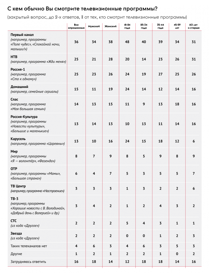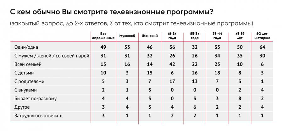 49% интервьюируемых смотрят телепрограммы в одиночку, 31% — со своими женами / мужьями / парами, 15% — всей семьей, 10% — с детьми. Среди людей в возрасте 18−24 лет преобладает семейный просмотр.