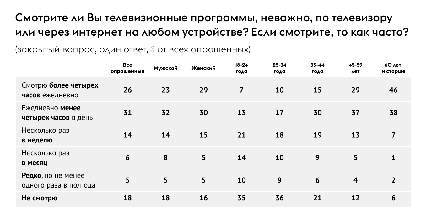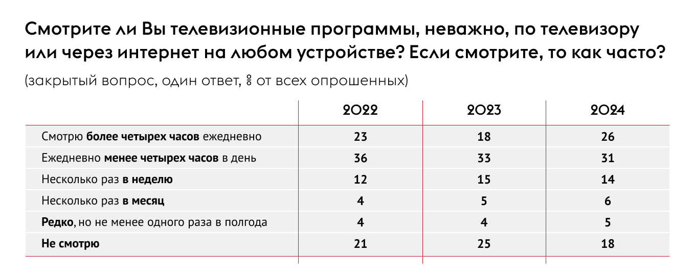 57% респондентов смотрят различные телепрограммы каждый день. Показатель за год вырос на 6 процентных пунктов. Доля зрителей увеличилась за счет роста доли тех, кто проводит за просмотром телепередач больше четырех часов в день (с 18 до 26%).