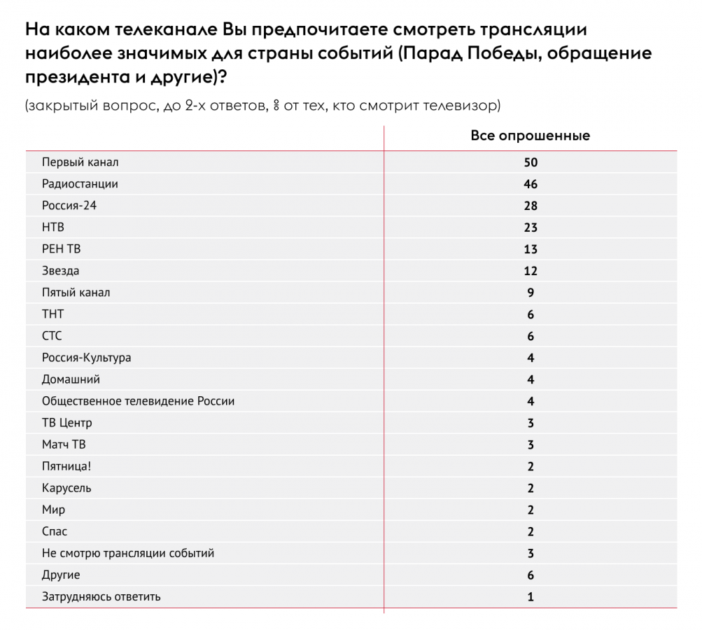 Лидером среди молодежи, привыкшей получать информацию из интернет-медиа и соцсетей, стал «Первый канал» (18−24 лет — 48%, 25−34 лет — 40%). Среди представителей старшего поколения первенство разделили «Первый канал» и НТВ, которые набрали по 31% голосов.
