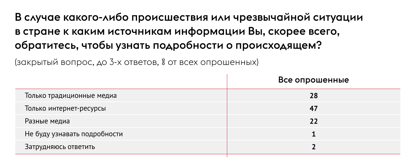 Только традиционные медиа выберут 28% опрошенных, для них это первоочередной и основной источник новостей в случае чрезвычайного происшествия и особенно высокой потребности в достоверной, актуальной информации. 47% указали только интернет-ресурсы, 22% назвали разные медиа — и традиционные, и интернет.
