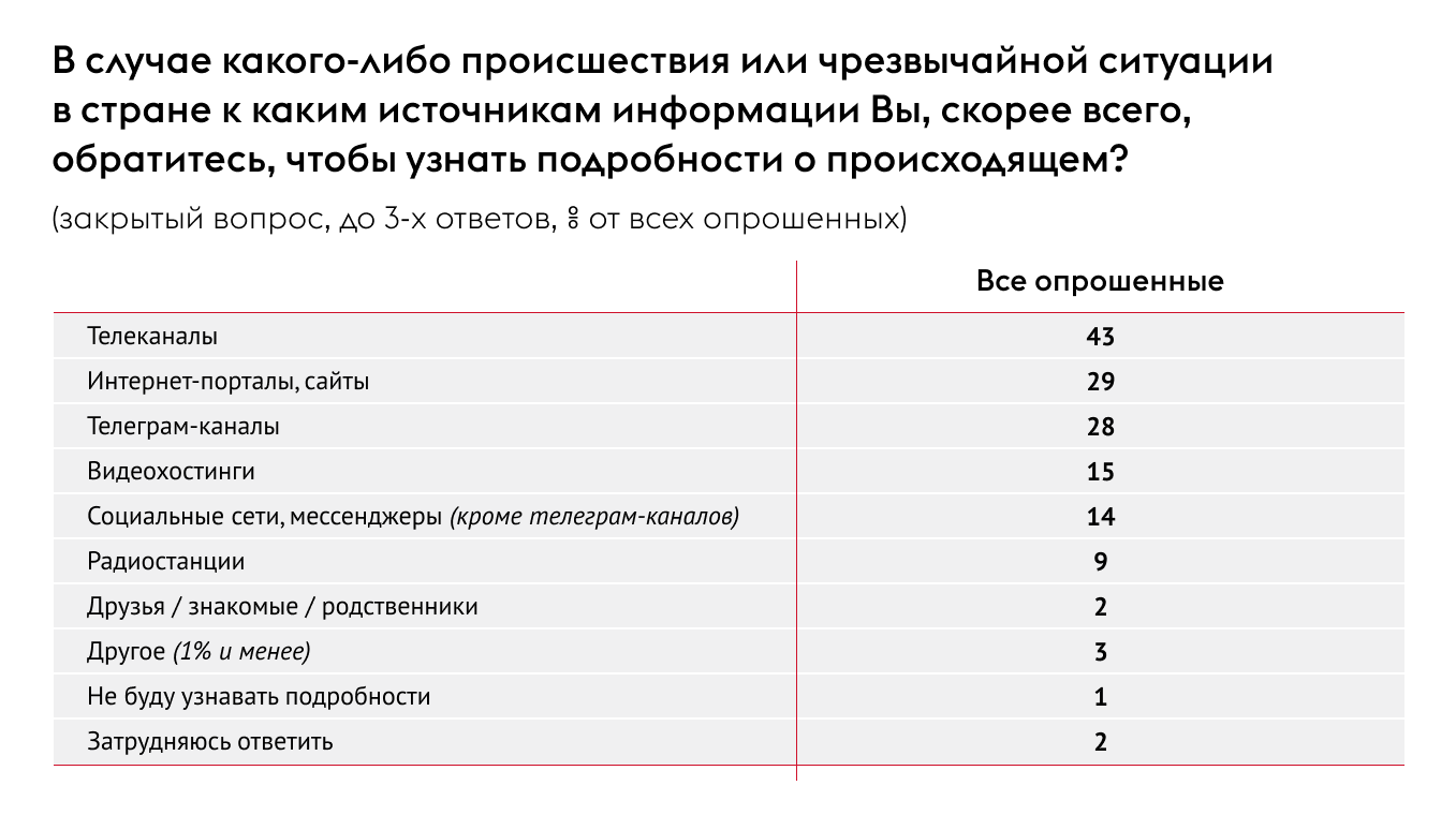 В случае чрезвычайных событий в стране 43% россиян предпочитают получать информацию от телеканалов. 29% выбирают онлайн-порталы, 28% — Telegram-каналы, 15% — видеохостинги, 14% — соцсети и мессенджеры, 9% — радио.