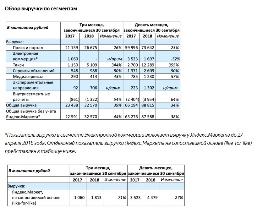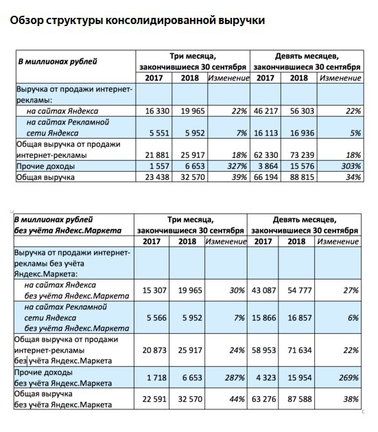 Без учета «Яндекс.Маркета» в третьем квартале 2018 года выручка «Яндекса» выросла на 44% до 32,6 млрд рублей ($496,6 млн). Скорректированная чистая прибыль (Adjusted net income) без учета «Яндекс.Маркета» увеличилась на 167% до 6 млрд рублей ($91,3 млн).