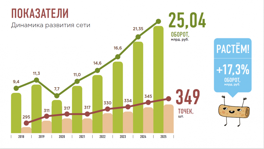 В 2025 году оборот «Теремка» вырос на 17,3% по сравнению с 2024 годом, до 25,04 млрд руб. За год было открыто 15 новых ресторанов, сейчас сеть насчитывает 349 заведений в Москве, Санкт-Петербурге и Краснодаре.