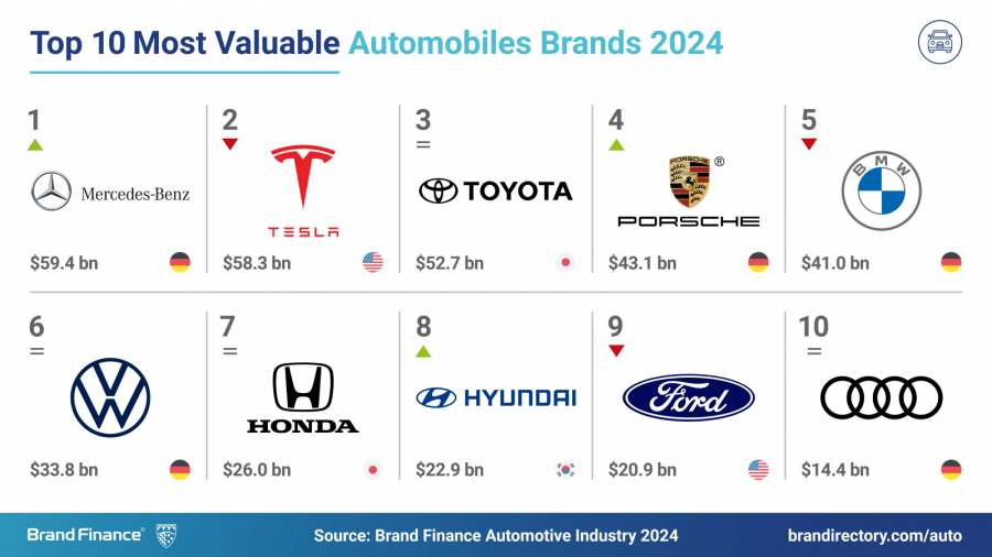 На третьей строчке рейтинга Toyota стоимостью $52,7 млрд. Замыкают топ-5 Porsche ($43,1 млрд) и BMW ($41 млрд). Также в десятку вошли Volkswagen ($33,8 млрд), Honda ($26 млрд), Hyundai ($22,9 млрд), Ford ($20,9 млрд) и Audi ($14,4 млрд).