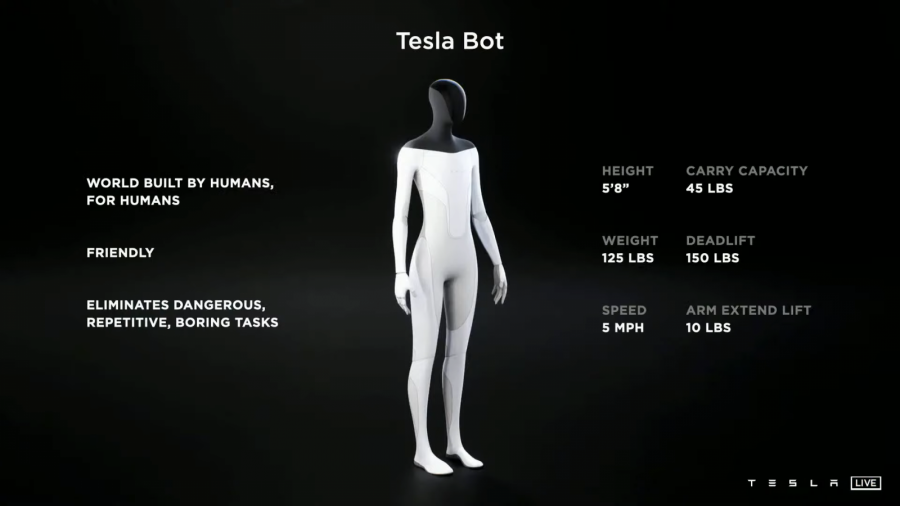 Одним из представленных проектов стал человекоподобный робот Tesla Bot, прототип которого будет выпущен в 2022 году. Это один из неавтомобильных вариантов использования разработок компании в области нейросетей и суперкомпьютера Dojo. Маск отметил, что электромобили Tesla похожи на «полуразумных роботов на колесах», и «имеет смысл придать им гуманоидную форму».